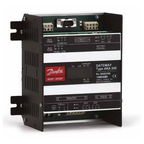 Интерфейсные модули АКА 245 являются системными компонентами для совместного использования с контроллерами АКС и ЕКС в управлении холодильным оборудованием ADAP-KOOL. Данные модули позволяют организовать комплексную систему с функциями удаленного управления, аварийного мониторинга, записи и сохранения данных о параметрах работы оборудования. Все контроллеры в системе ADAP-KOOL соединены между собой посредством двухпроводной витой пары. АКА 245 позволяет подключать 120 контроллеров. До 119 — ЕКС/АК2 по LON RS 485.